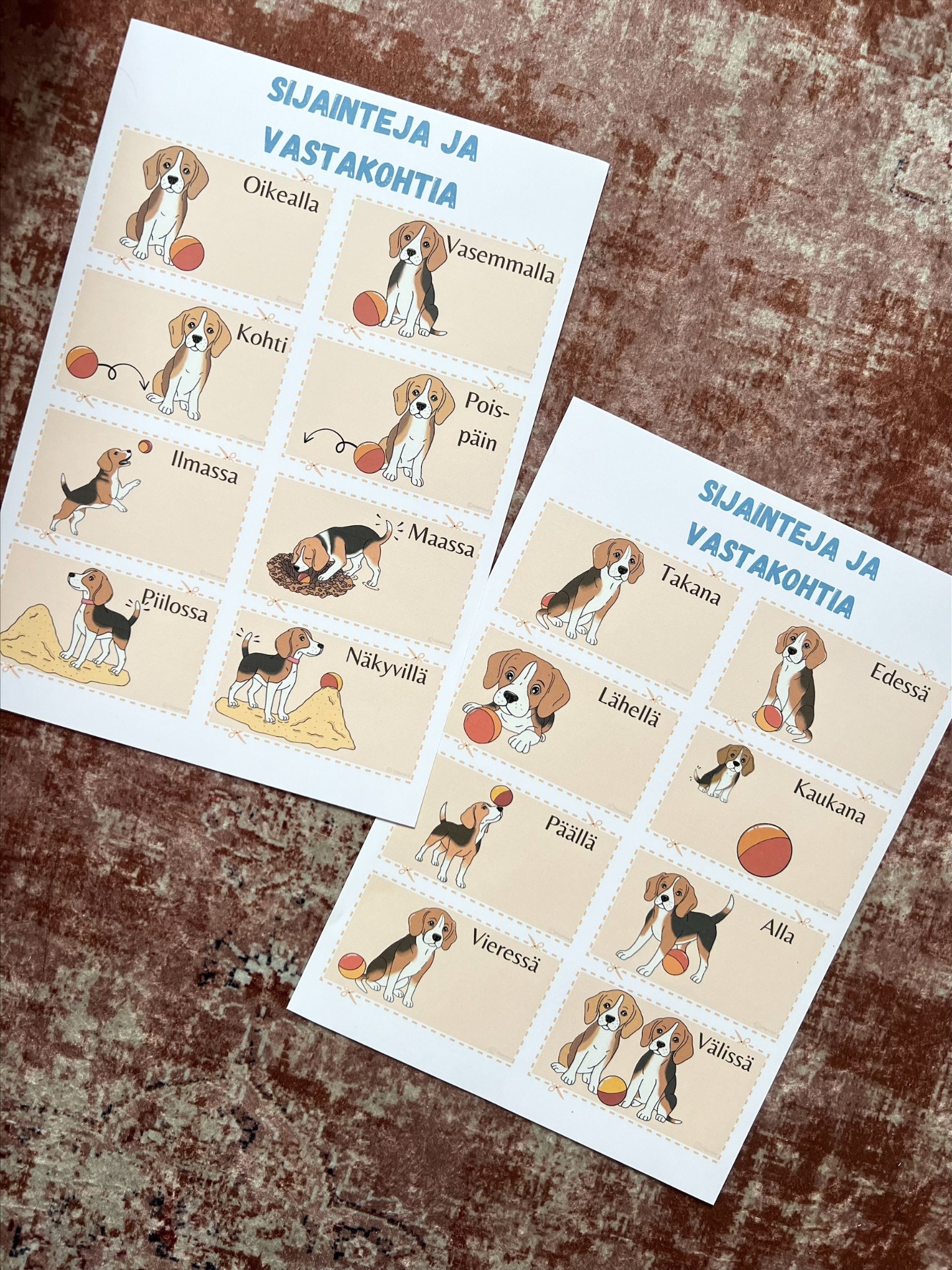 sijaintikäsitteitä ja vastakohtia (esim. päällä–alla, edessä–takana)